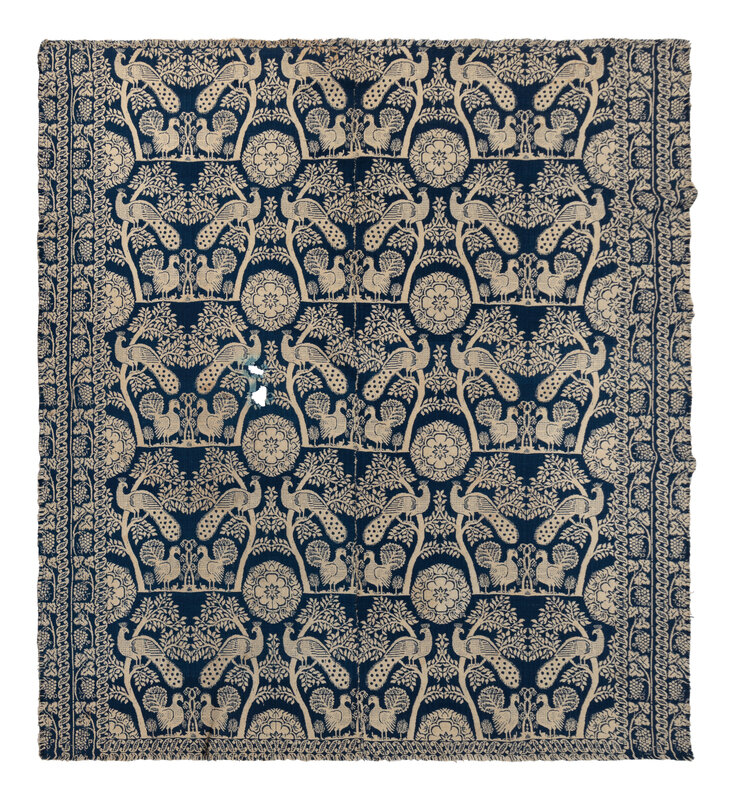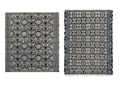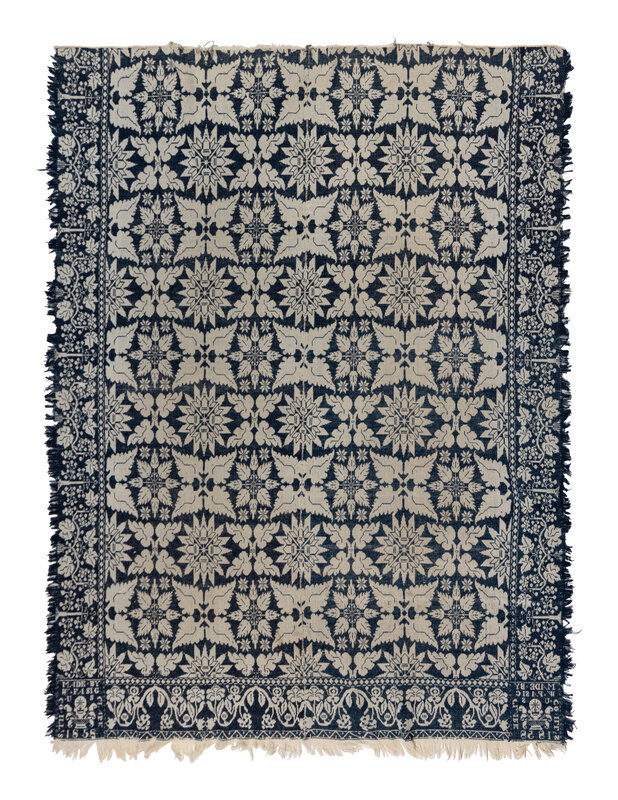 Example 2: natural cotton and blue wool. Inscribed Made by W Fasig Clark Co Illi's US 1858. 91 1/4 × 73 5/8 inches.