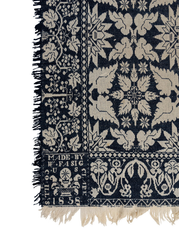 "William Fasig was born in Lebanon County, Pennsylvania, March 13, 1801. In 1824 he moved to Wayne County, Ohio, and in 1834 to Richland County, where he remained until 1847. After a short time in Missouri, he went to Clark, County, Illinois, and settled near Martinsville. He was a brick layer and farmer as well as a weaver, laying brick in the fall and farming in the summer. He married Elizabeth Hibschman (1803-1882) of Lebanon County, Pennsylvania." Mildred Davison and Christa C. Mayer-Thurman, Coverlets: A Handbook on the Collection of Woven Coverlets in The Art Institute of Chicago, exh. cat. (Chicago: Art Institute of Chicago, 1973), 216, cat. 149.