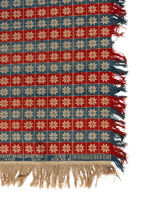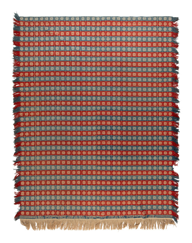 Example 1: a cotton and wool coverlet, woven by Isaac Brubaker (American, c.1806-1887), 1883. 103 1/2 × 80 1/8 inches.