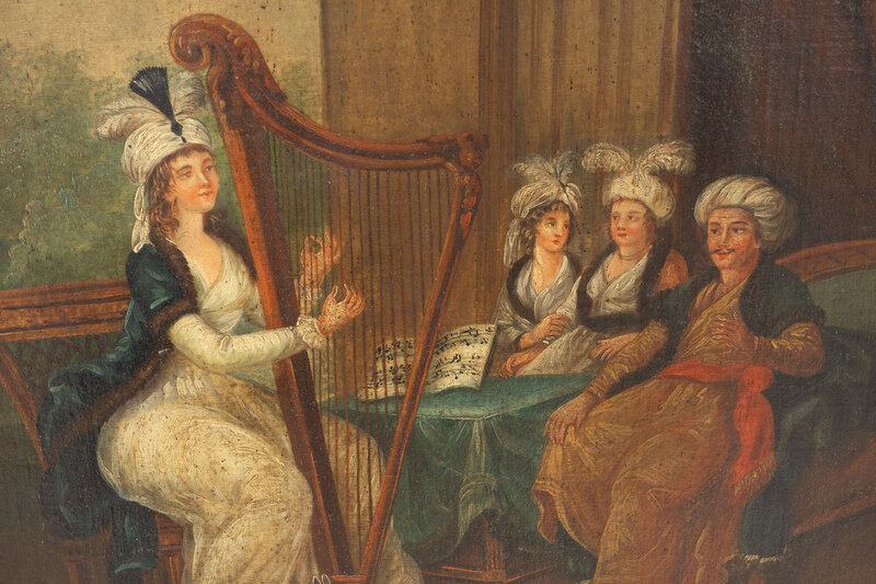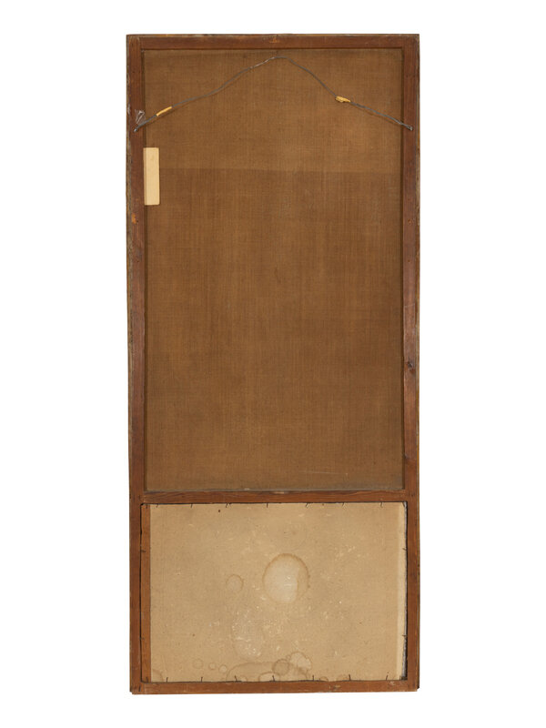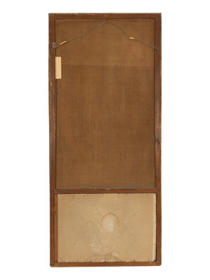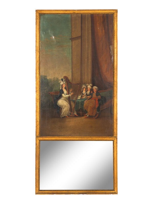 With original mirror glass below oil on canvas portrait of court scene.