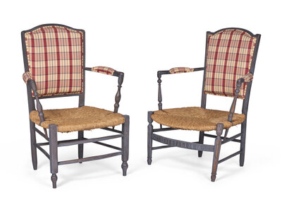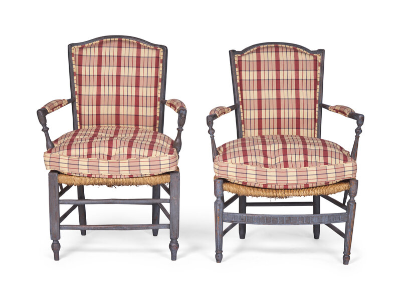 Each with a curved crest rail over padded back and rush seat, the frames painted in a French blue, the loose seat cushions covered in a red, blue and taupe checked ribbed upholstery; the slightly larger example stamped 'PSHP' to the reverse of the crest rail.