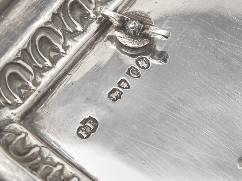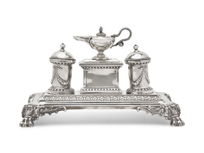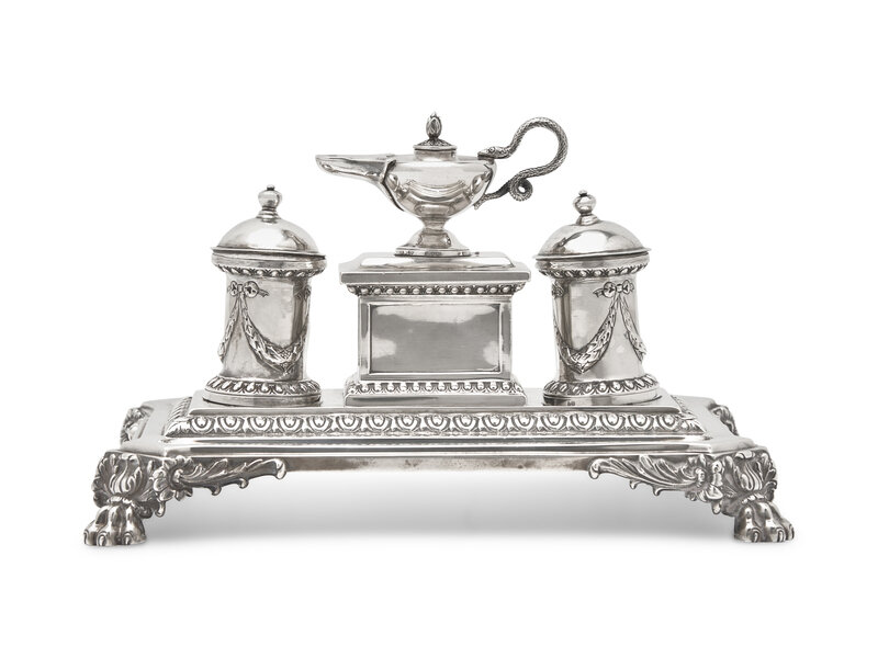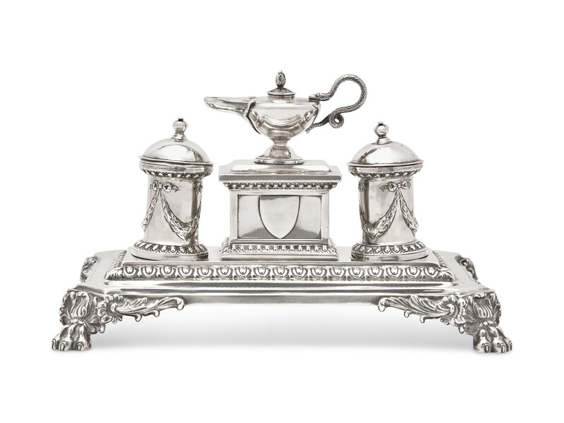 The underside of the oil-lamp shaped lid stamped 'wBj' in a shield for Walter and John Barnard and marks for London, 1878; the underside of the base stamped with 'FE' in a dual circle cartouche, probably for Frederick Elkington, further marks for London, 1878 and pattern number '647'