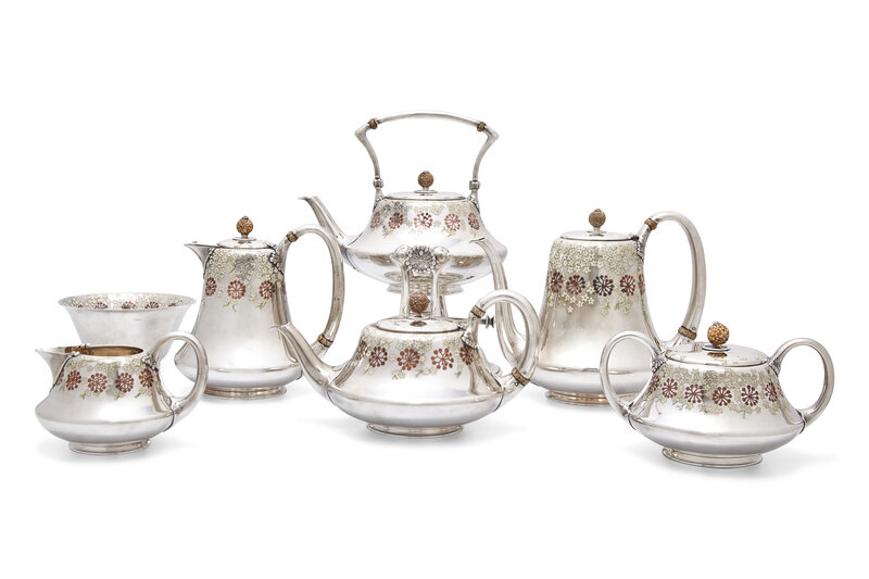 A Tiffany & Co. Seven-Piece Sterling Silver, Copper and Enameled Tea and Coffee Service