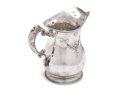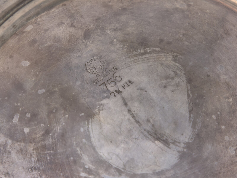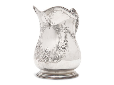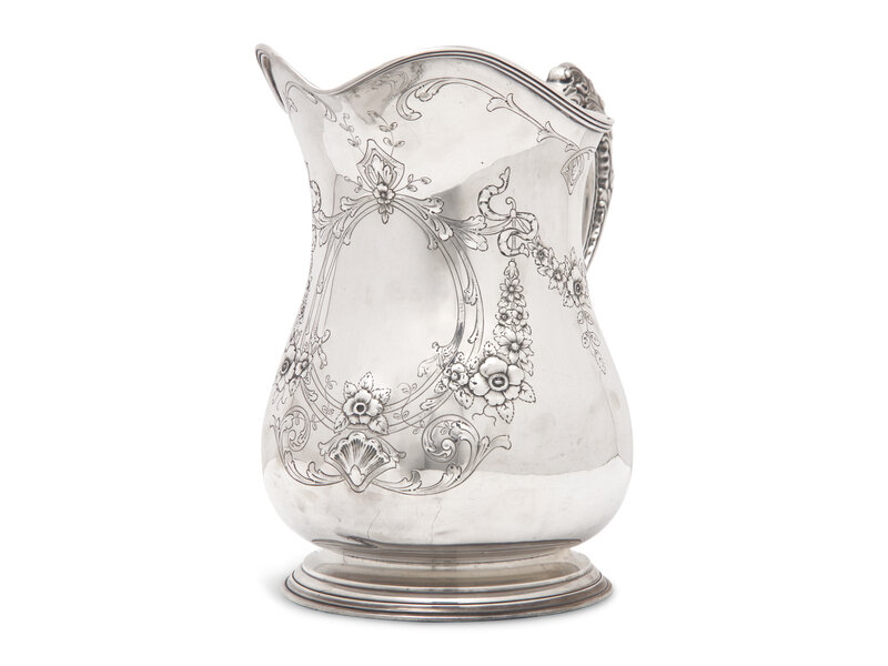 Decorated with motifs of floral garlands and a central cartouche; marked 'STERLING / 756 / 7 3/4 PINTS' to underside