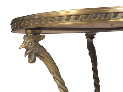 The inset fossilized marble top atop rooster-form monopodia connected by circular stretcher shelf.