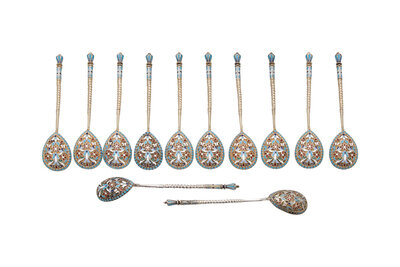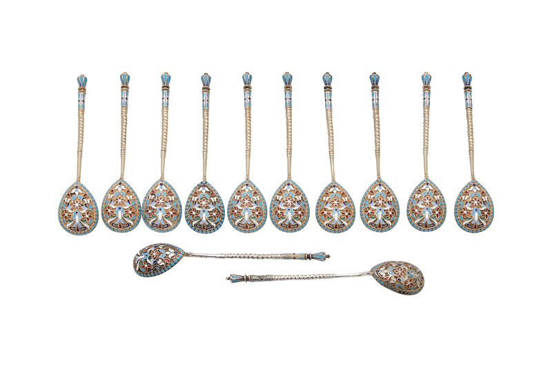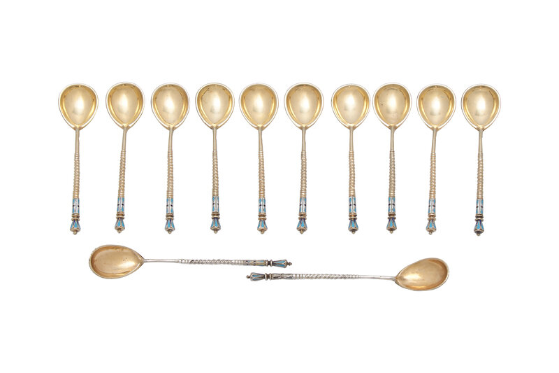A Set of Twelve Russian Gilt-Washed Silver and Cloisonné Enamel Coffee Spoons