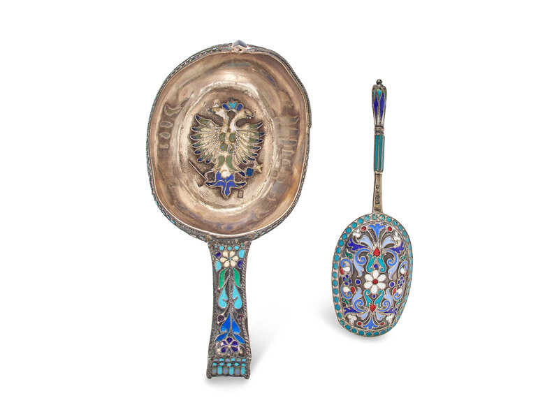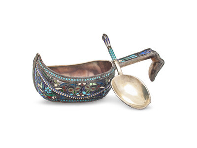 A Russian Silver and Cloisonné Enamel Kovsh and Spoon