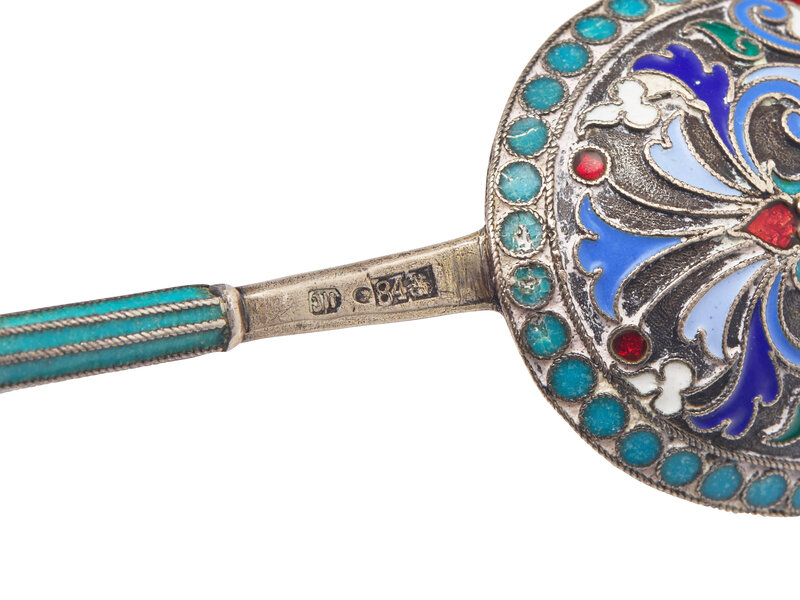The interior of the kovsh well featuring an imperial two-headed eagle and stamped with a standard mark '84' and maker's mark 'AФ' for Aleksandr Fuld (Moscow, 1862-1917); the spoon stamped with a standard mark '84' and maker's mark 'ИС' for Ivan Saltykov (Moscow, 1884-1897)