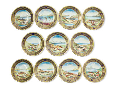 A Set of Eleven Royal Crown Derby Hand-Painted and Parcel-Gilt Fish Plates