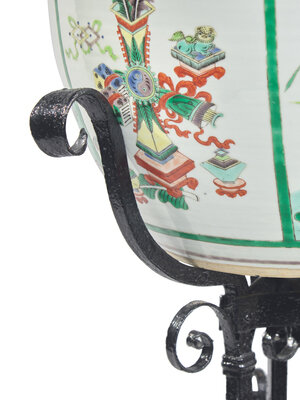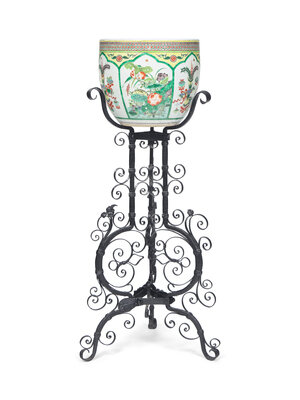 A Chinese Famille Verte Porcelain Jardinière on Victorian Wrought Iron Stand
