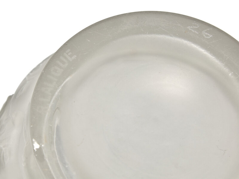Etched 'R. Lalique' and engraved '26' to the underside of the base.