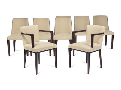 Comprising: two armchairs and six side chairs, covered in a cream upholstery.