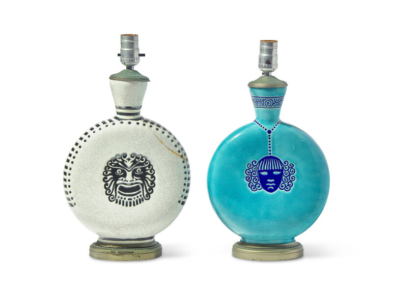 One example with a cream ground and black mask, the other with a turquoise ground and cobalt mask.