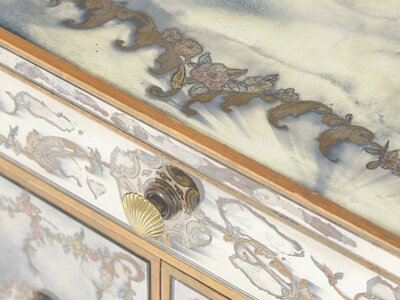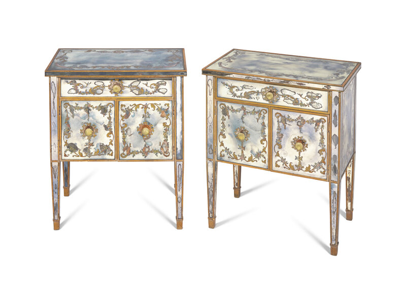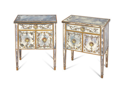 A Pair of Venetian Style Reverse-Painted Glass and Mirrored Petite Commodes