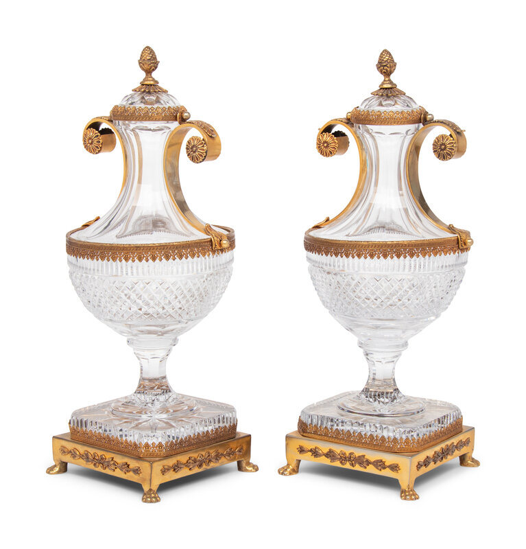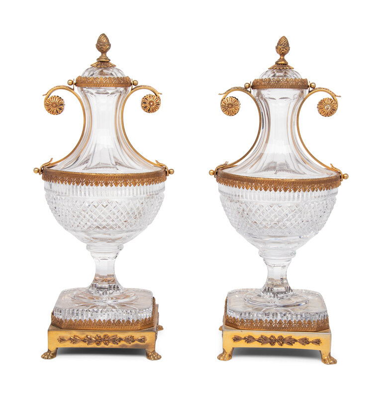 A Pair of Gilt Metal Mounted Cut Gass Urns