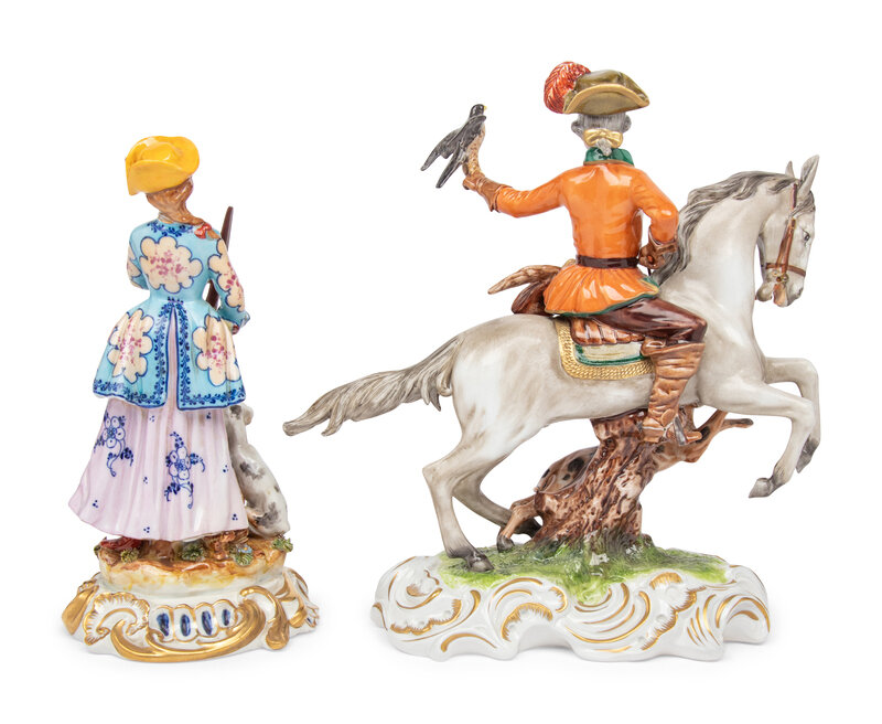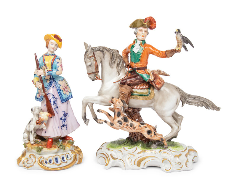 the Unterweissbach group depicting a falconer on horseback (base cracked); the French group depicting a lady with a hunting hound and a rifle.