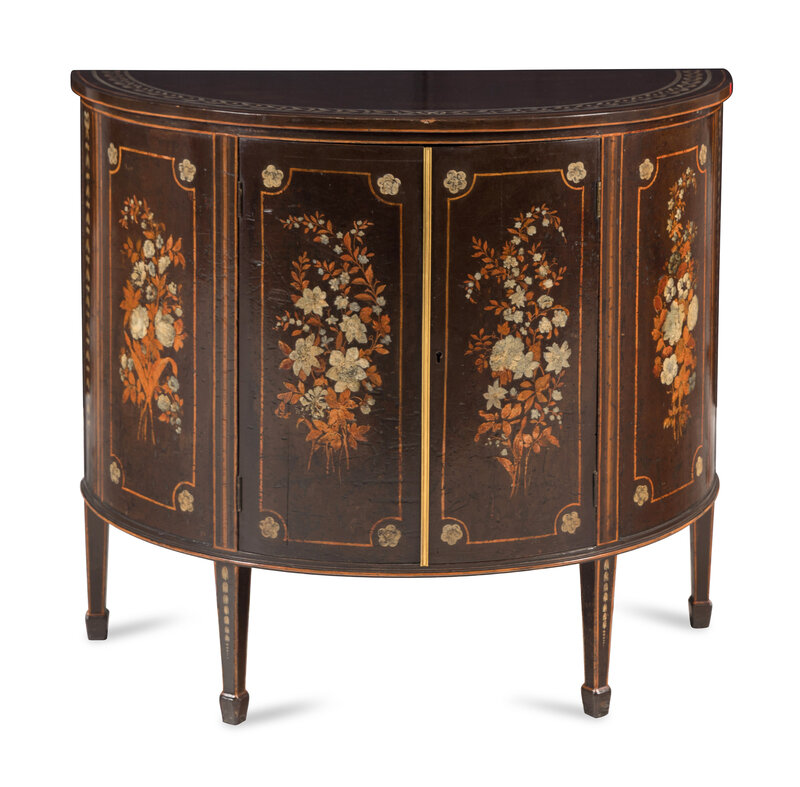 A Continental Polychrome Decorated Marble-Top Demilune Cabinet