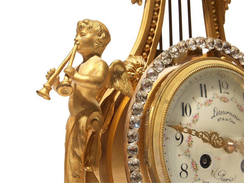 comprising a clock pendule, of lyre form, surmounted by sun masque and floral garland and flanked by trumpeting putti, the enamel-decorated face inscribed, "Letourneur/ Her de la Cour/ Paris", the pendulum with external ring encrusted with paste stones, the movement bearing impressed Japy Frères & Cie mark and impressed with numerals, "63/ 106", and a pair of four-light candelabras, of floral urn form, the candlecups in the form of roses.