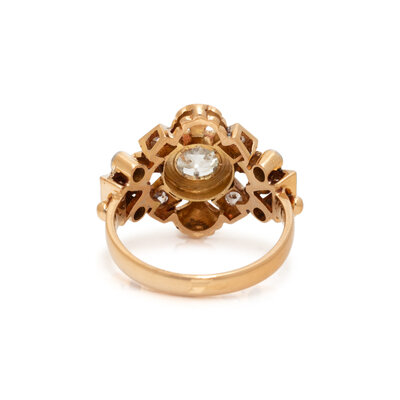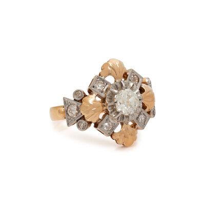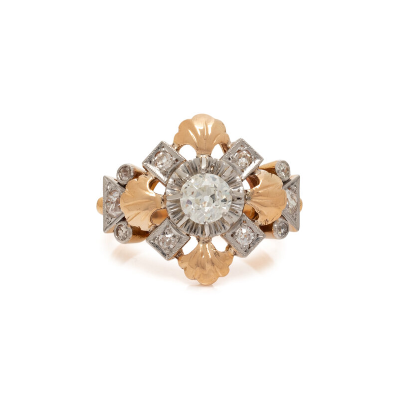 Round, old European, and single cut diamonds weighing approximately 0.70 carat total. Yellow and white gold. Ring size 5 3/4.
