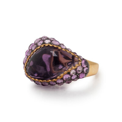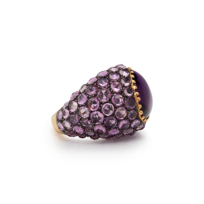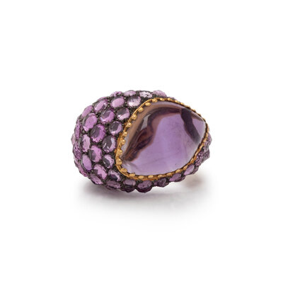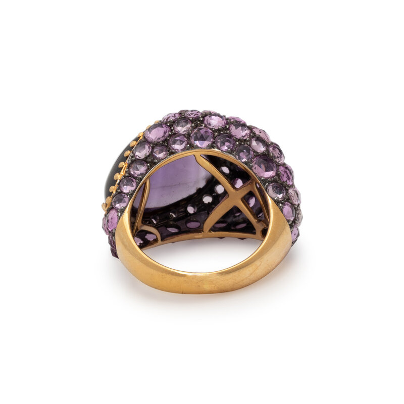 Rose cut and freeform cabochon amethyst. 18 karat yellow gold. Ring size 6.
