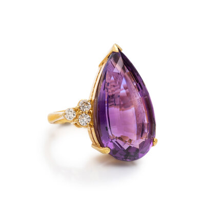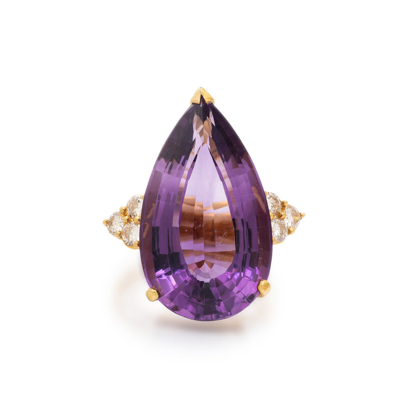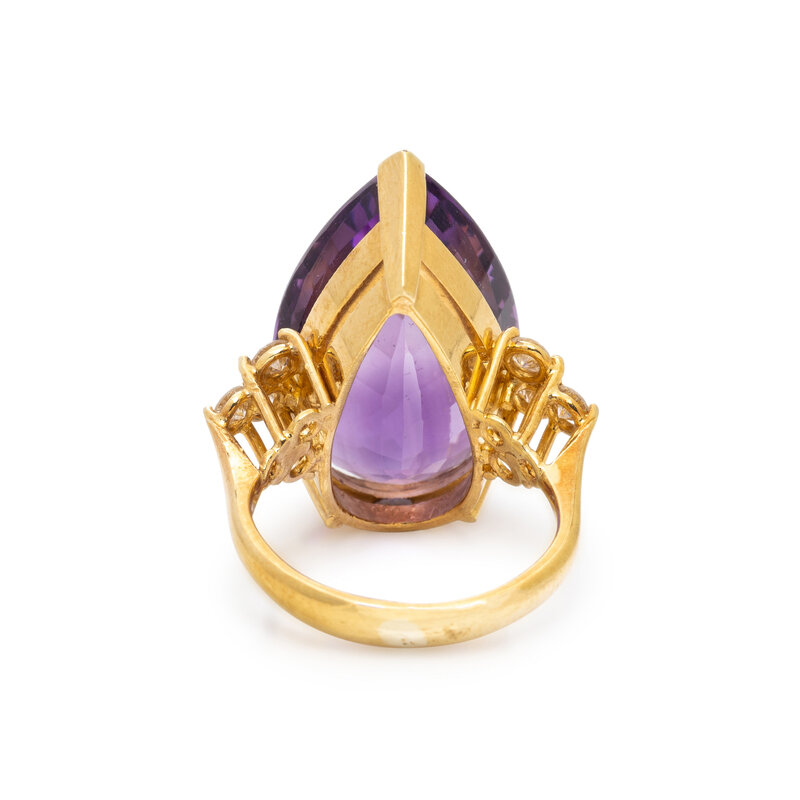 Pear shaped amethyst measuring approximately 25.00 x 14.80 x 10.15 mm, and round diamonds. 18 karat yellow gold. Ring size 5 1/2.