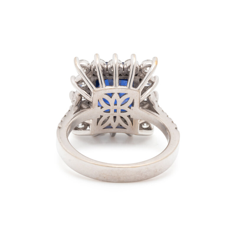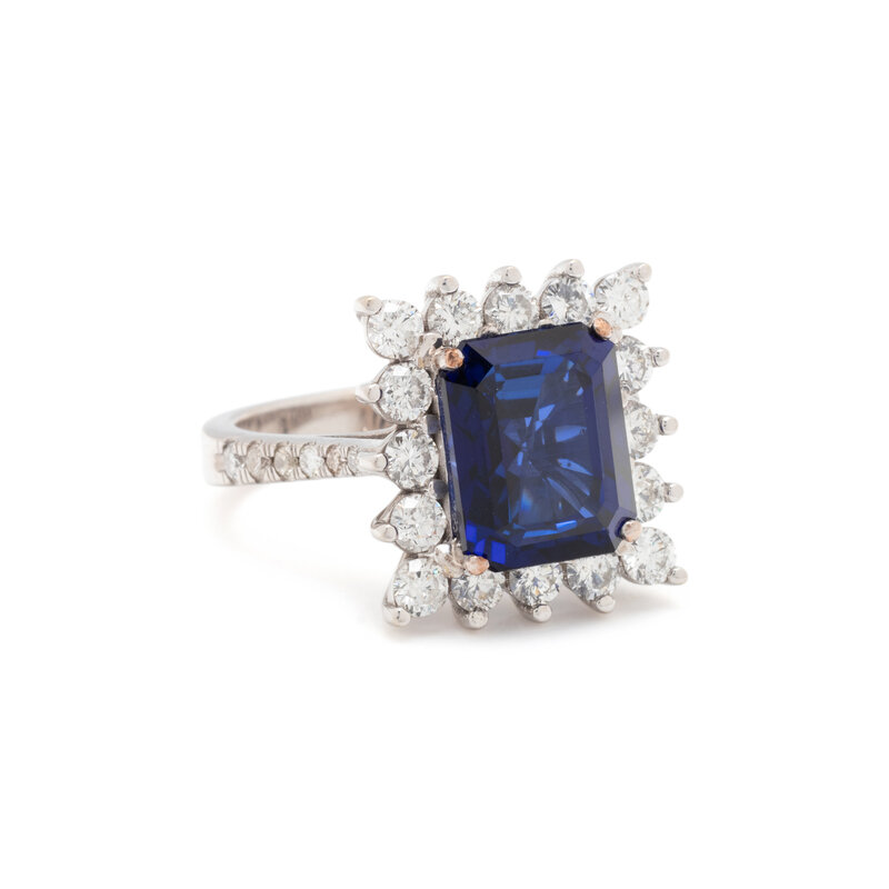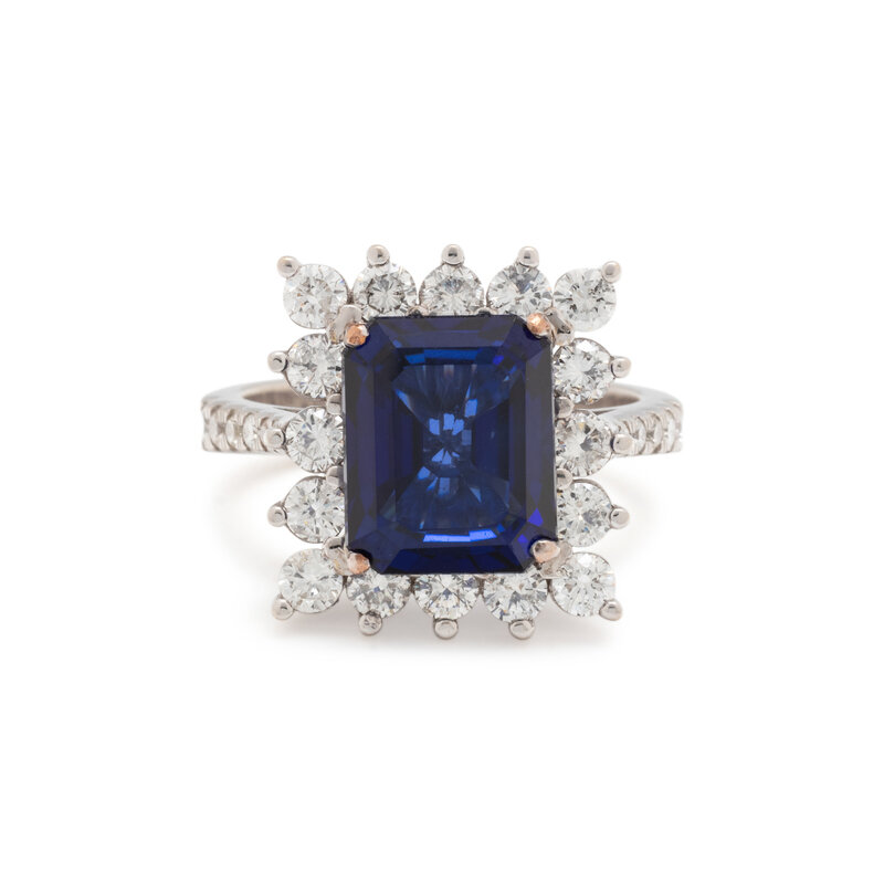 Emerald cut titanium diffused sapphire weighing 6.88 carats and round diamonds weighing approximately 1.50 carats total. White gold. Ring size 7 1/2.