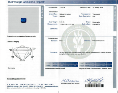 AGL, 2024, Report No. 1137516, Natural Corundum, Sapphire, Heated, Diffusion Treatment