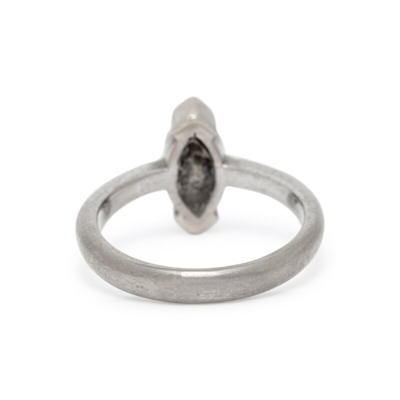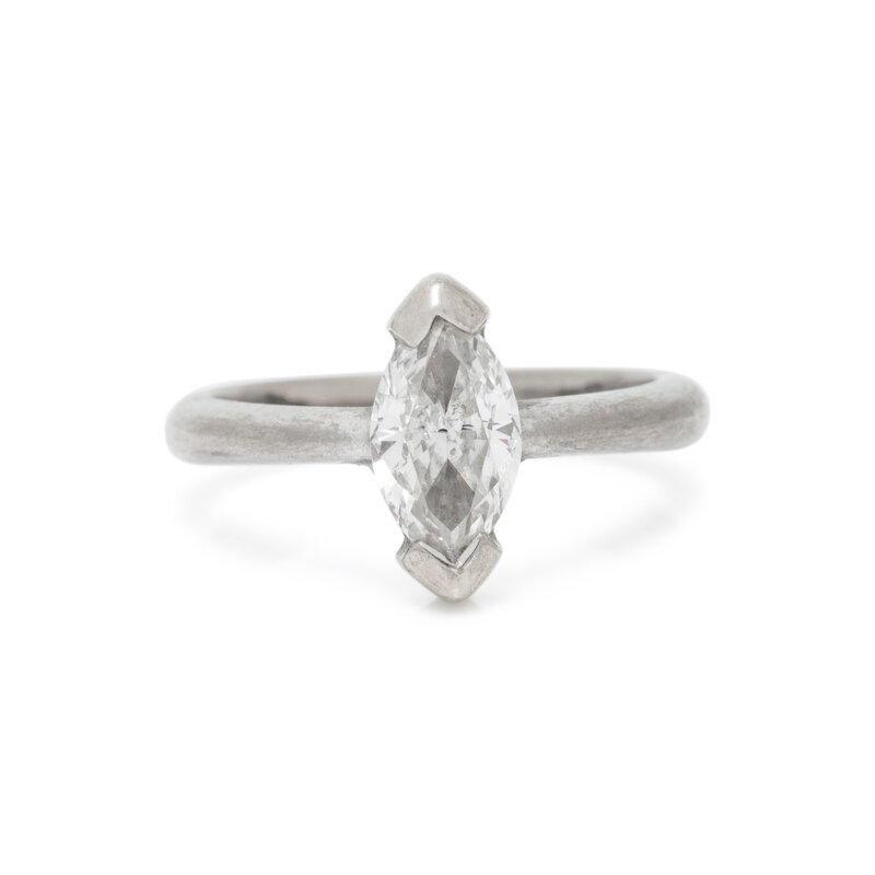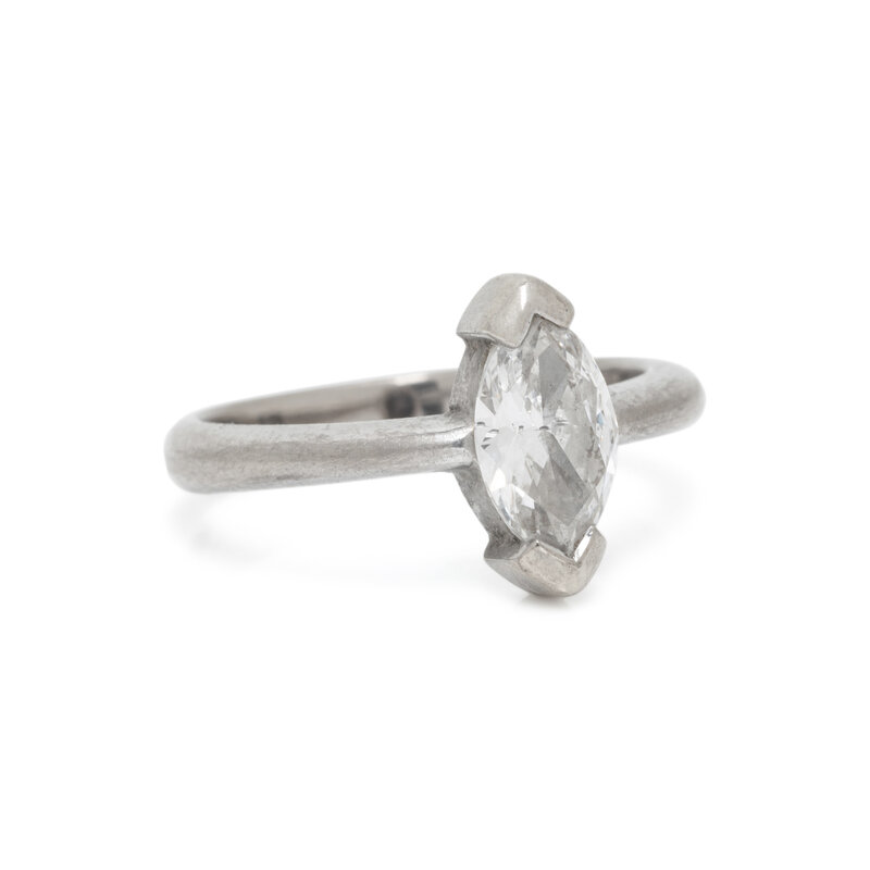 Marquise cut diamond weighing approximately 0.75 carat. 18 karat white gold. Ring size 5 3/4.
