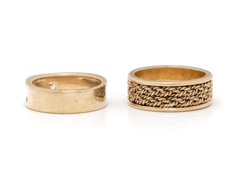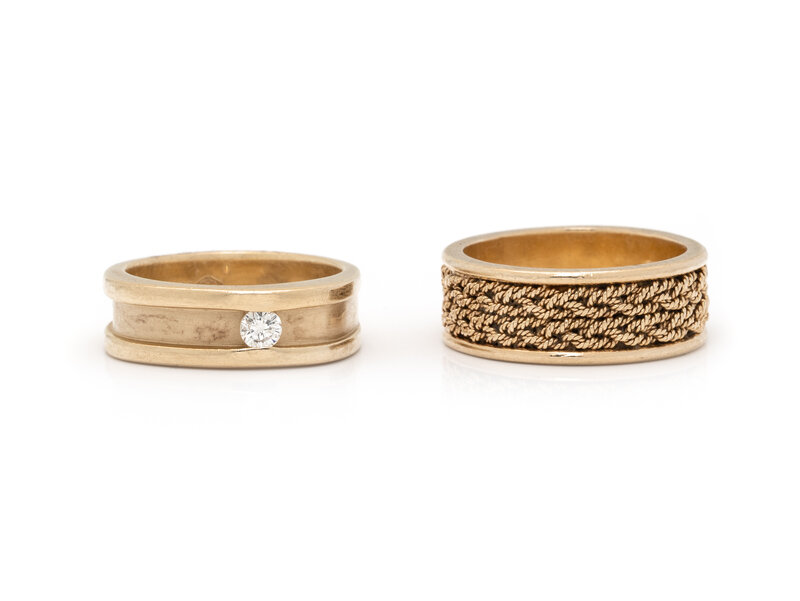 One with a round diamond. 14 karat yellow gold. Ring sizes 6 and 6 3/4.