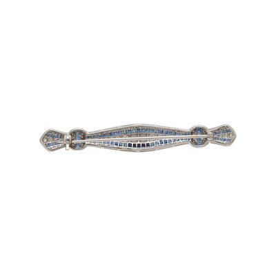 Round and transitional cut diamonds weighing approximately 1.30 carats total and square sapphires. 18 karat white gold. 2 3/4 x 7/16 inches.