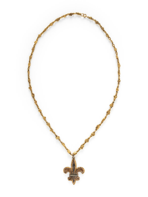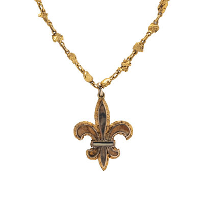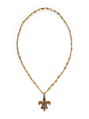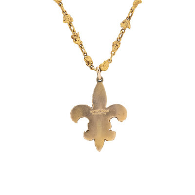 The fleur de lis pendant set with inlaid hardstone. Yellow gold. Chain: 18 inches long. Pendant: 1 1/2 inches long.