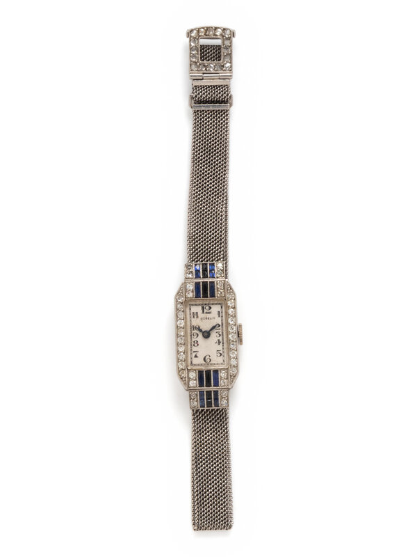 Stamps: Case back: DÉPOSÉ 183. Movement: GÜBELIN SWISS. Clasp: G.F. GENEVE (maker's marks) PLATINE.