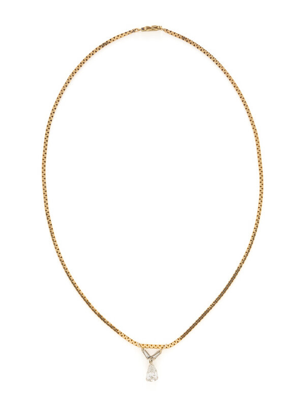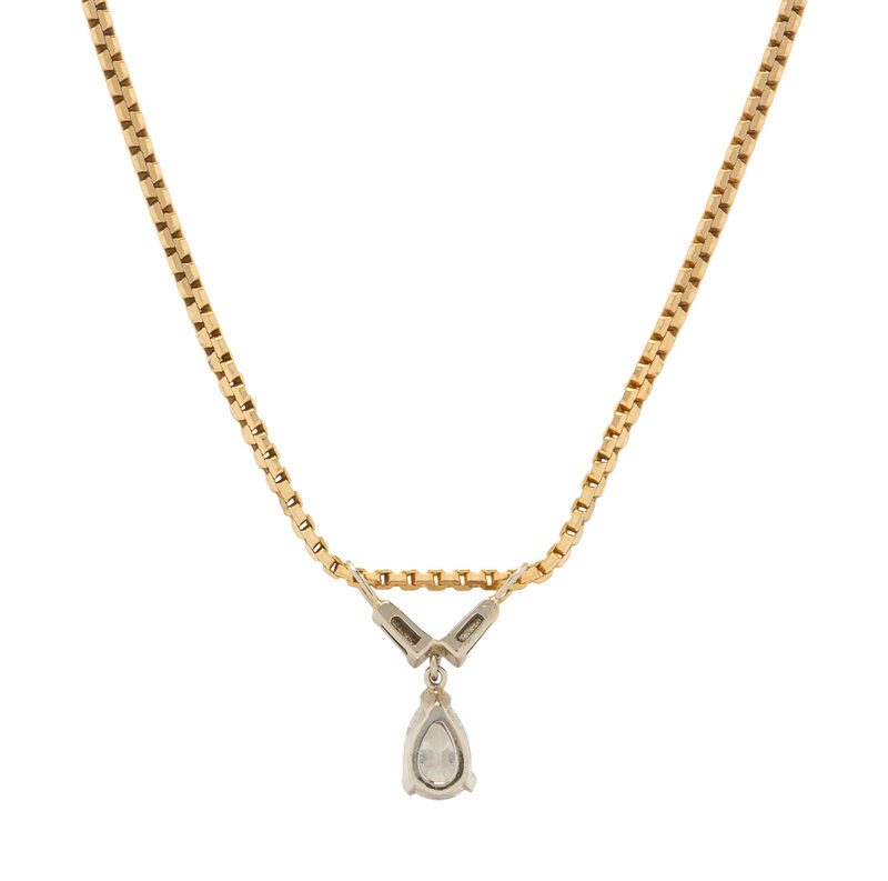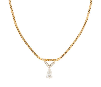 Pear shaped diamond weighing approximately 1.15 carats and two tapered baguette cut diamonds. Yellow and white gold. 18 inches long.