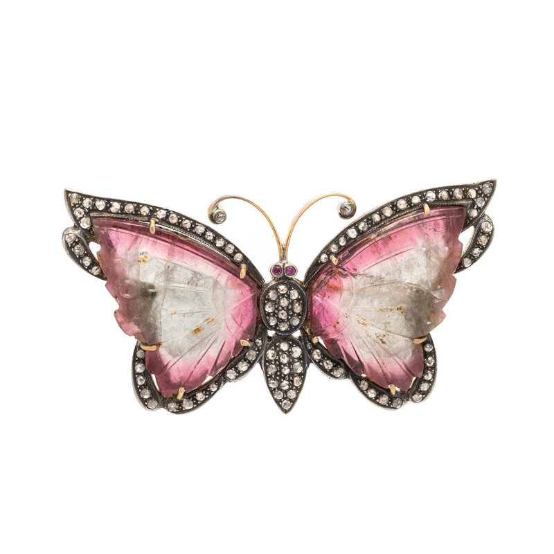 Carved tourmaline wings, round ruby eyes, and rose cut diamonds. Silver-topped 14 karat yellow gold. 2 1/2 x 1 3/8 inches.