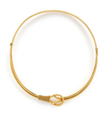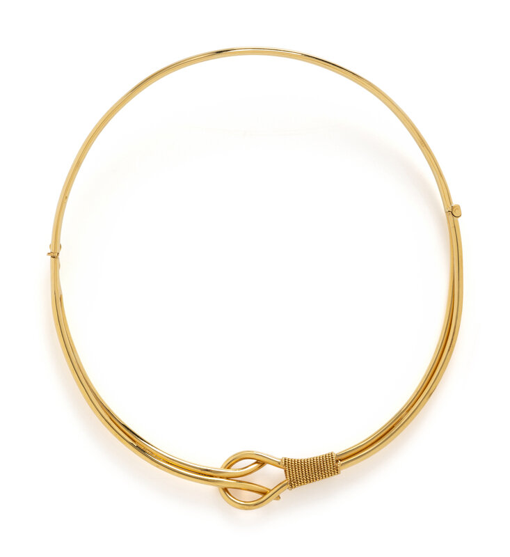 Hinged with side clasp. 18 karat yellow gold. 16 inches inner circumference.