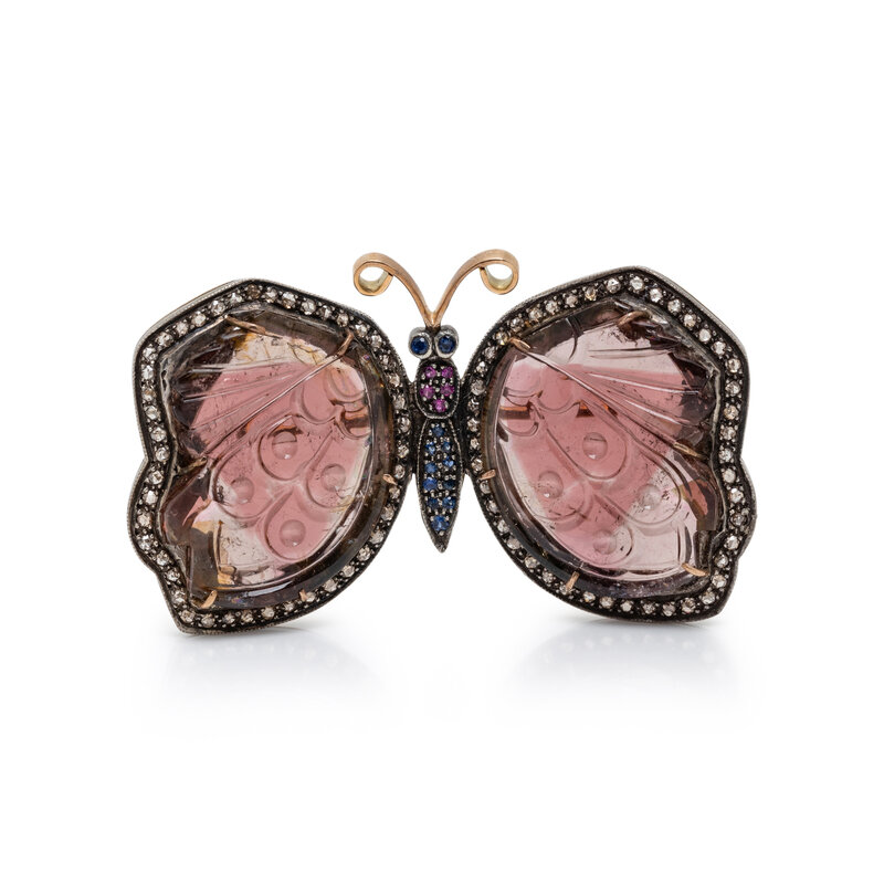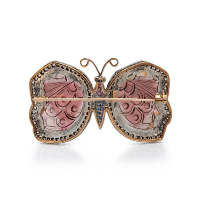 Carved tourmaline, rose cut diamonds, round rubies and sapphires. Silver-topped 14 karat yellow gold. 2 1/4 x 1 1/4 inches.