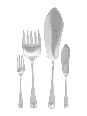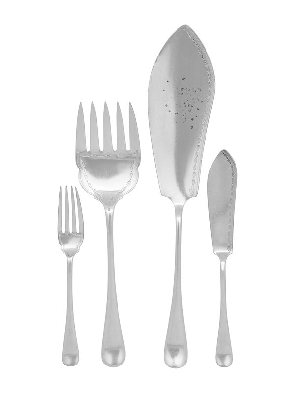 comprising 12 fish forks, 12 fish knives and a two-piece serving set, in a fitted oak case.