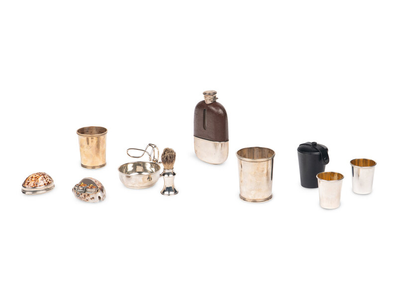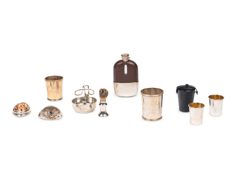 comprising a George III cowrie shell snuff box by Phipps & Robinson, London, 1796, engraved with coat-of-arms; a cowrie shell double inkwell; a Deakin & Francis Ltd., shave brush and cup, Birmingham, 1920 & 1926; a cased pair of Gorham travel beakers; a Gorham flask, monogrammed; and two graduated E. Jaccard & Co., St. Louis julep cups, the smaller monogrammed.