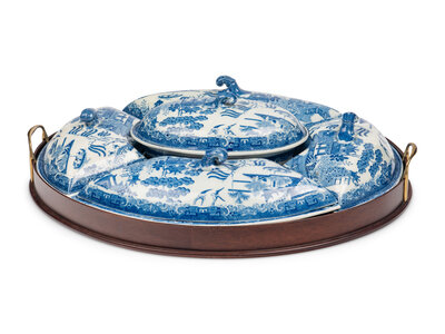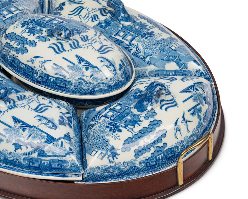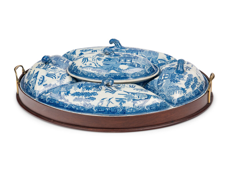 comprising five covered dishes in a fitted mahogany tray.