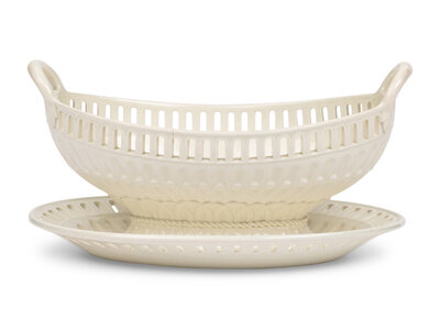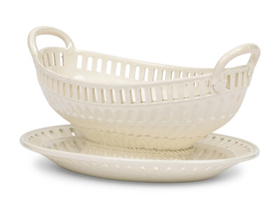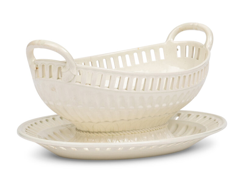the basket impressed WEDGWOOD to underside; the stand with T date mark impressed to underside.