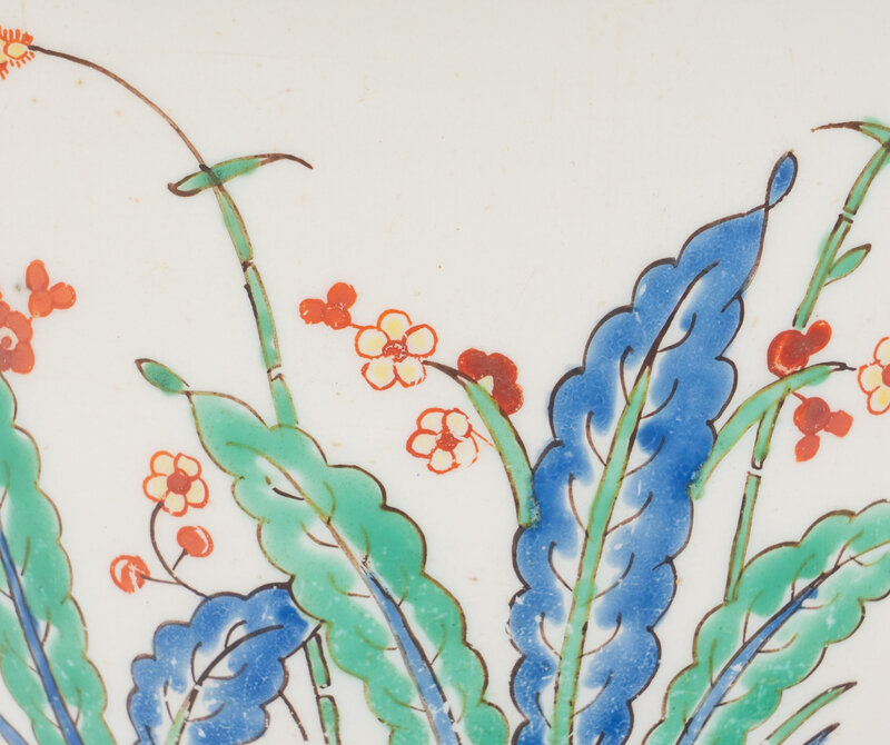 one painted with a squirrel on a banded hedge with trailing vines, the other with flowering plants and an insect, the undersides with hunting horn marks in iron-red enamel.