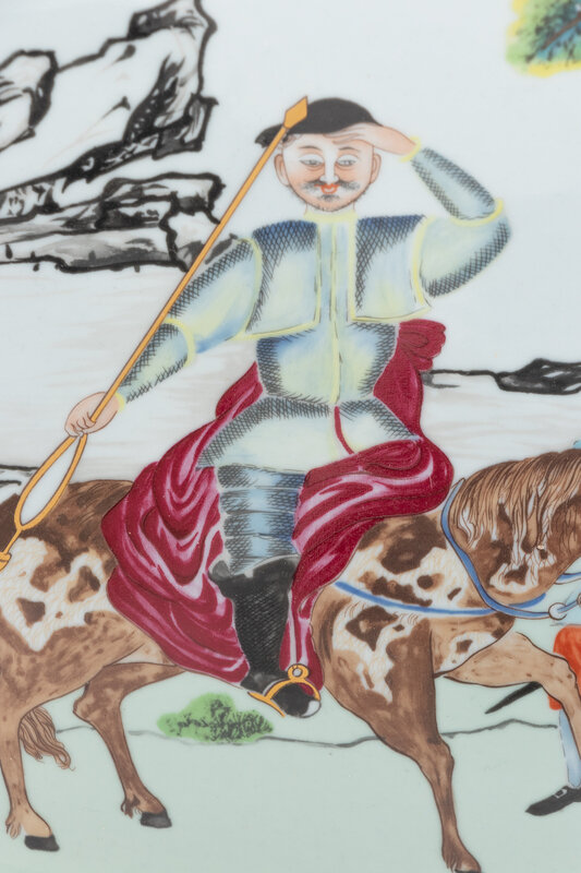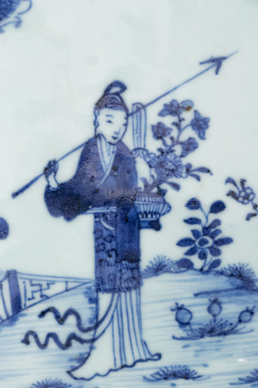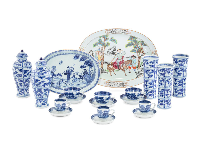 comprising a Nelson Rockefeller pattern serving dish, three blue-and-white decorated vases a pair of similarly decorated covered vases, three tea cups and saucers and three coffee cups and saucers, together with an associated Chinese Export blue-and-white porcelain platter; 13 items total.