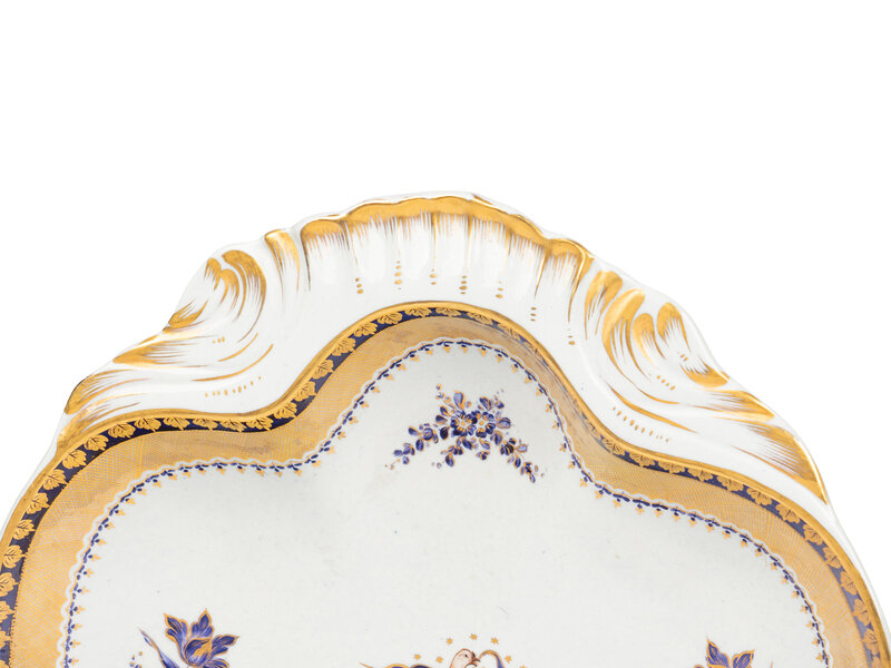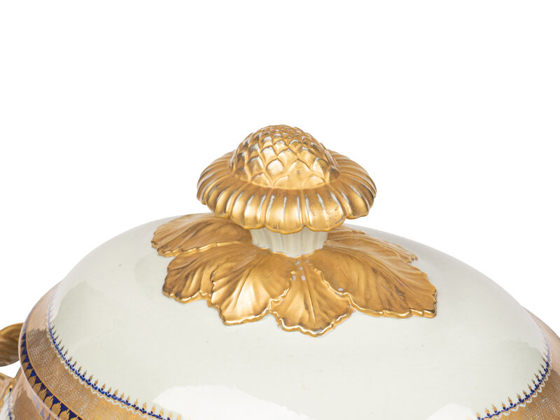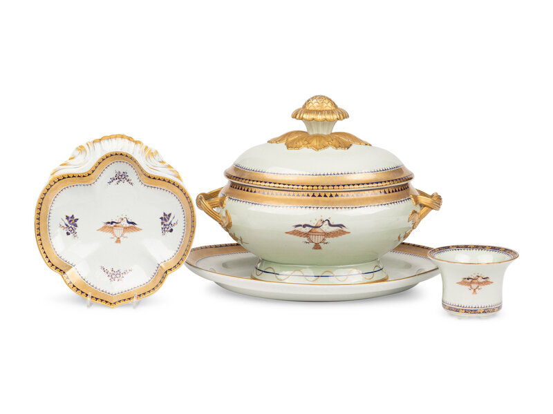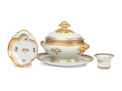 in the Chinese export taste, comprising a covered tureen and platter, a scalloped dish and a cache pot.