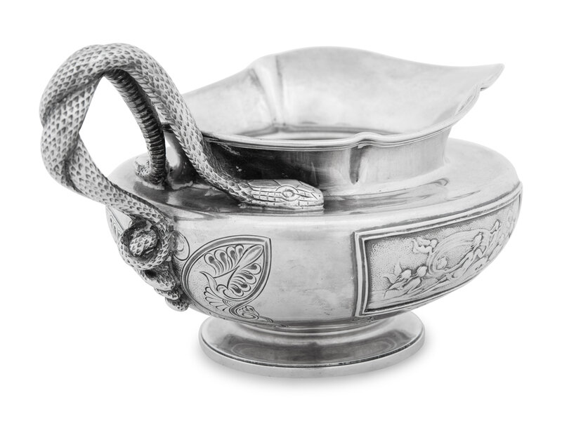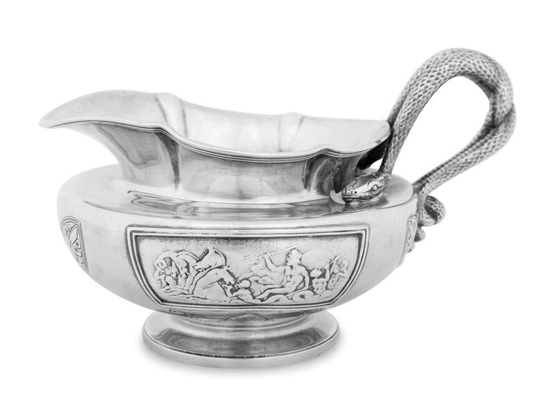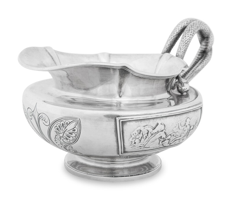 the design incorporating decorative plaques after John Flaxman, R.A. (1755-1826) depicting classical scenes of trumpeting tritons celebrating the union of Poseidon and the sea goddess Amphitrite, with an intertwined serpent handle;