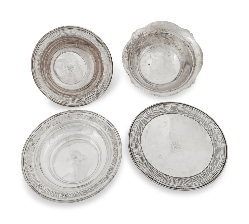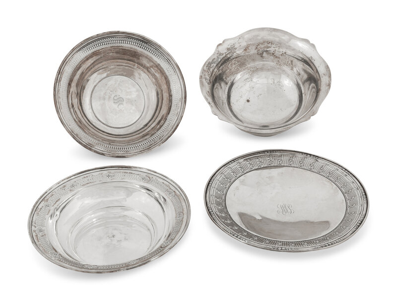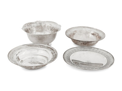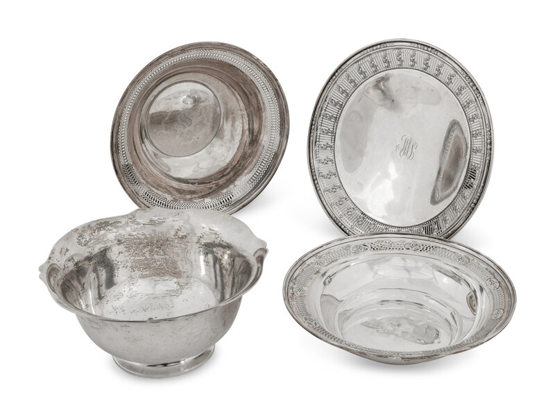 comprising a bowl by R. Wallace & Sons Mfg. Co., Wallingford, CT; a bowl by Richard Dimes Co., Boston, MA; a bowl by Matthews Co., Newark, NJ; and a footed low compote bearing no maker's mark.