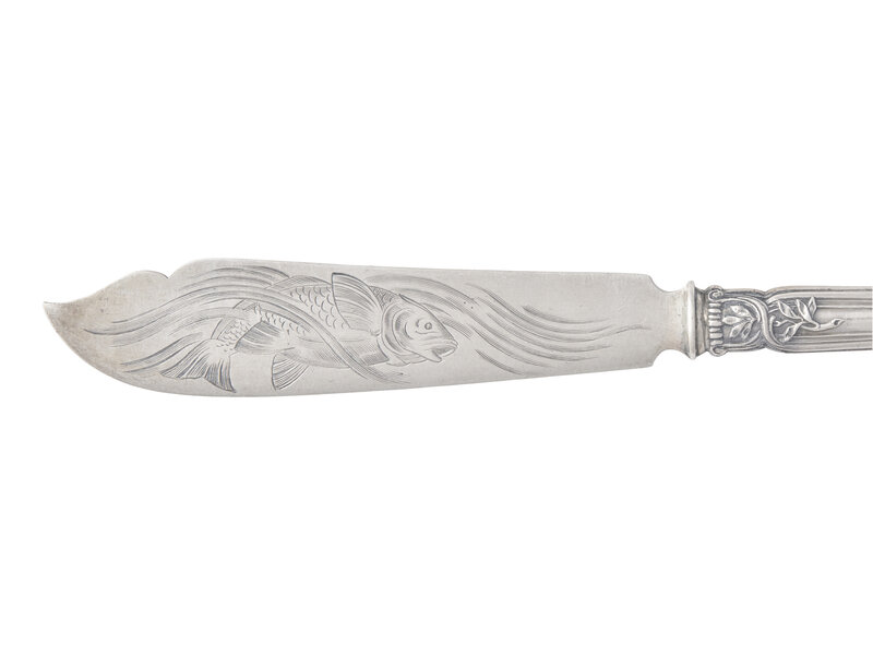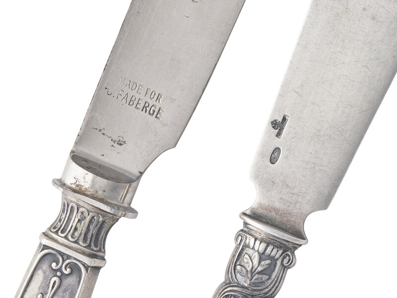the set of fish knives, 1899, with cast foliate handles, engraved with monogram, "RL", the blades engraved with fish, marked with .840 standard mark and assayer mark; and the single pronged knife, 1908-1926, with cast Neoclassical handle, marked with .840 standard mark with city code for Moscow, and maker's mark, the blade also marked, "Made For C. Faberge."