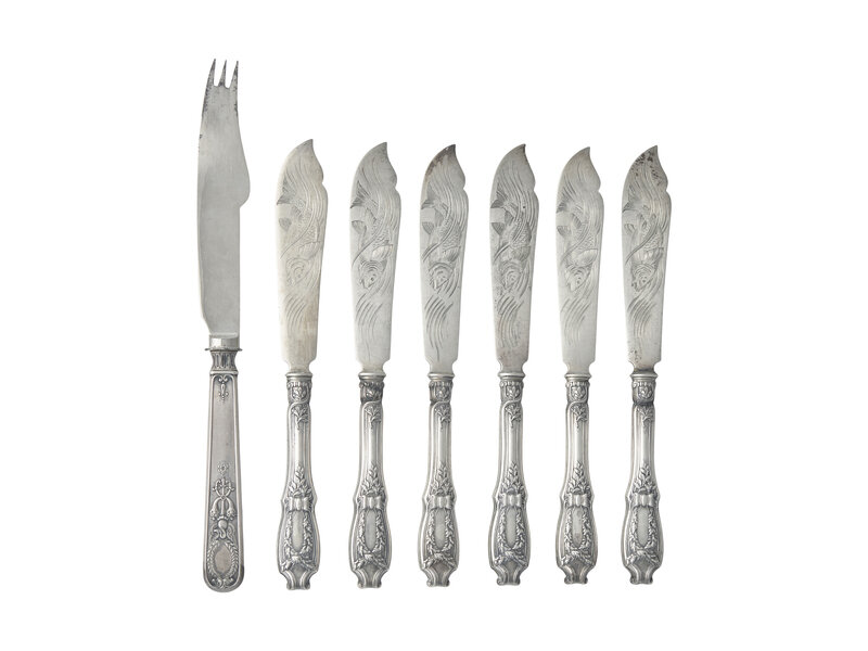 A Set of Six Russian Silver Fish Knives and a Single Russian Silver Knife