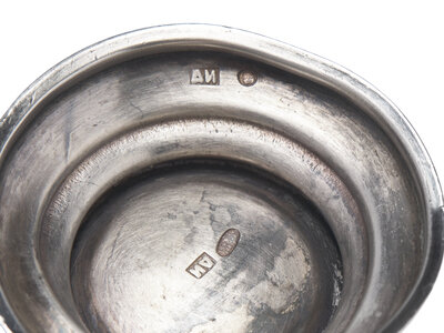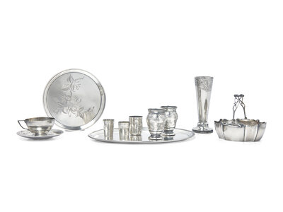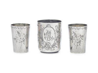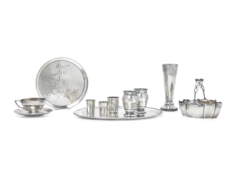 comprising a sugar basket, Moscow, 1908-1926, marked with Kokoshnik mark and maker's mark; a pair of cups, 1908-1926, engraved with foliate motifs and monogram, "FC," marked with Kokoshnik mark, city code for Moscow, and maker's mark; a single shot cup, 1908-1924, engraved with foliate motifs monogram, "SA," and date, "1909/ 31/ 1," marked with Kokoshnik mark, city code for Moscow, and maker's mark; a pair of shot cups, probably silver, engraved with foliate motifs, apparently unmarked; a teacup and saucer, 1908-1924, engraved with Art Nouveau waterlily motifs, both marked with Kokoshnik mark, city code for Moscow, and maker's mark; a round tray, 1898-1908, engraved with floral motifs to well, marked with Kokoshnik mark, Assayer Ivan Sergeyevich Lebedkin, Moscow, and maker's mark; an oval tray with faint monogram, "MH," by Ivan Petrovitch Khlebnikov, Moscow, marked with .840 standard mark, city mark for Moscow, date mark (rubbed), and maker's mark; and a tapered beaker or vase, 1898-1908, engraved with fruit and foliate motifs, marked with Kokoshnik mark, Assayer Ivan Sergeyevich Lebedkin, Moscow, and maker's mark.