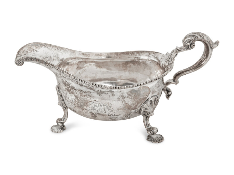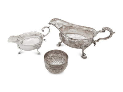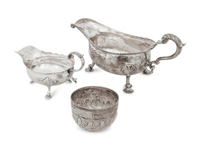 comprising a gravy boat marked for Susannah Brasted, London, 1891; a sauce boat, Daniel & John Welby, London, 1890; and a small bowl, William Hutton & Sons, London, 1886.