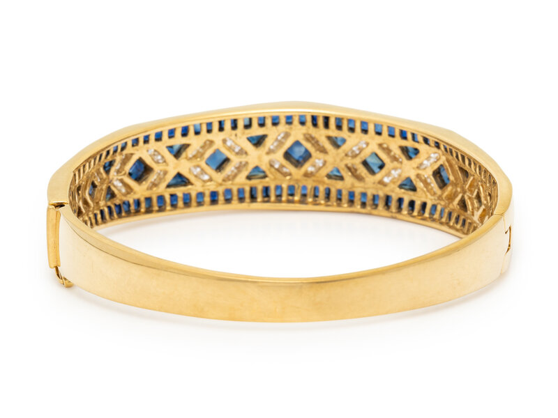 Round diamonds weighing approximately 1.30 carats total, square and triangular cut sapphires, hinged with side clasp. 18 karat yellow gold. 7 1/2 inches inner circumference.